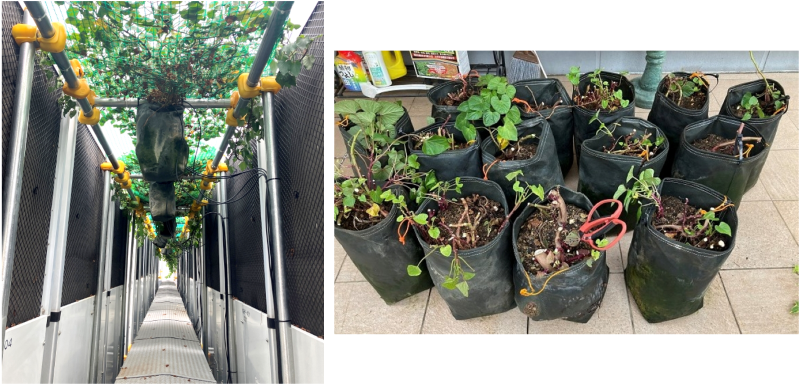 「室外機芋緑化システム」とは、バケツほどの大きさの布袋に土とサツマイモの苗を入れ、
